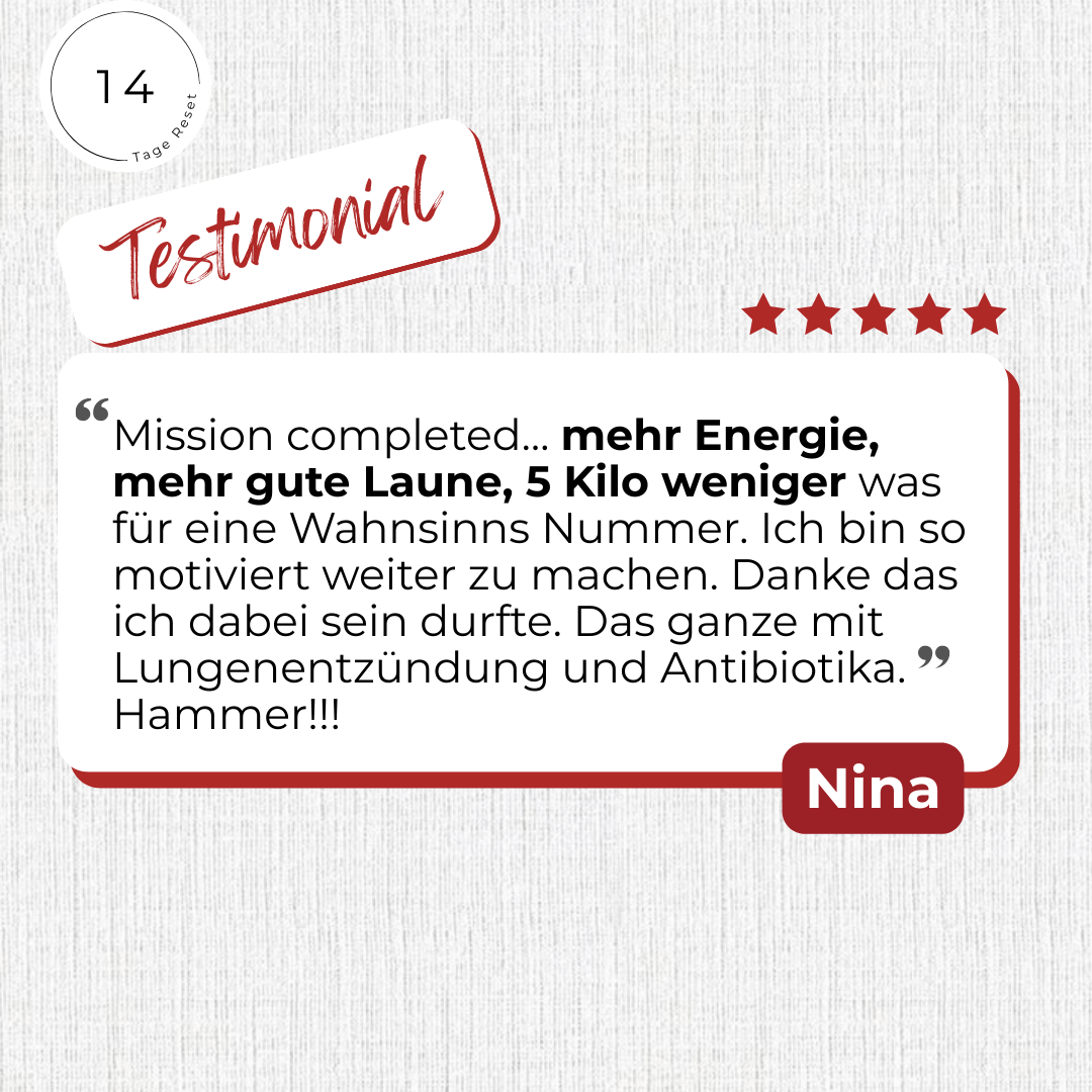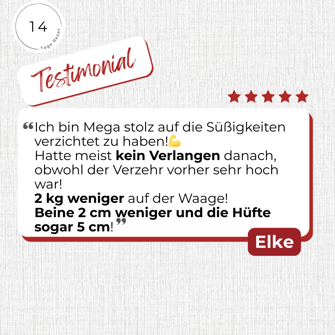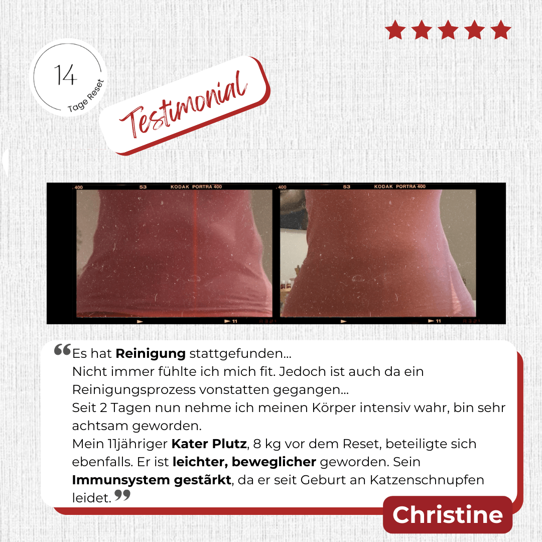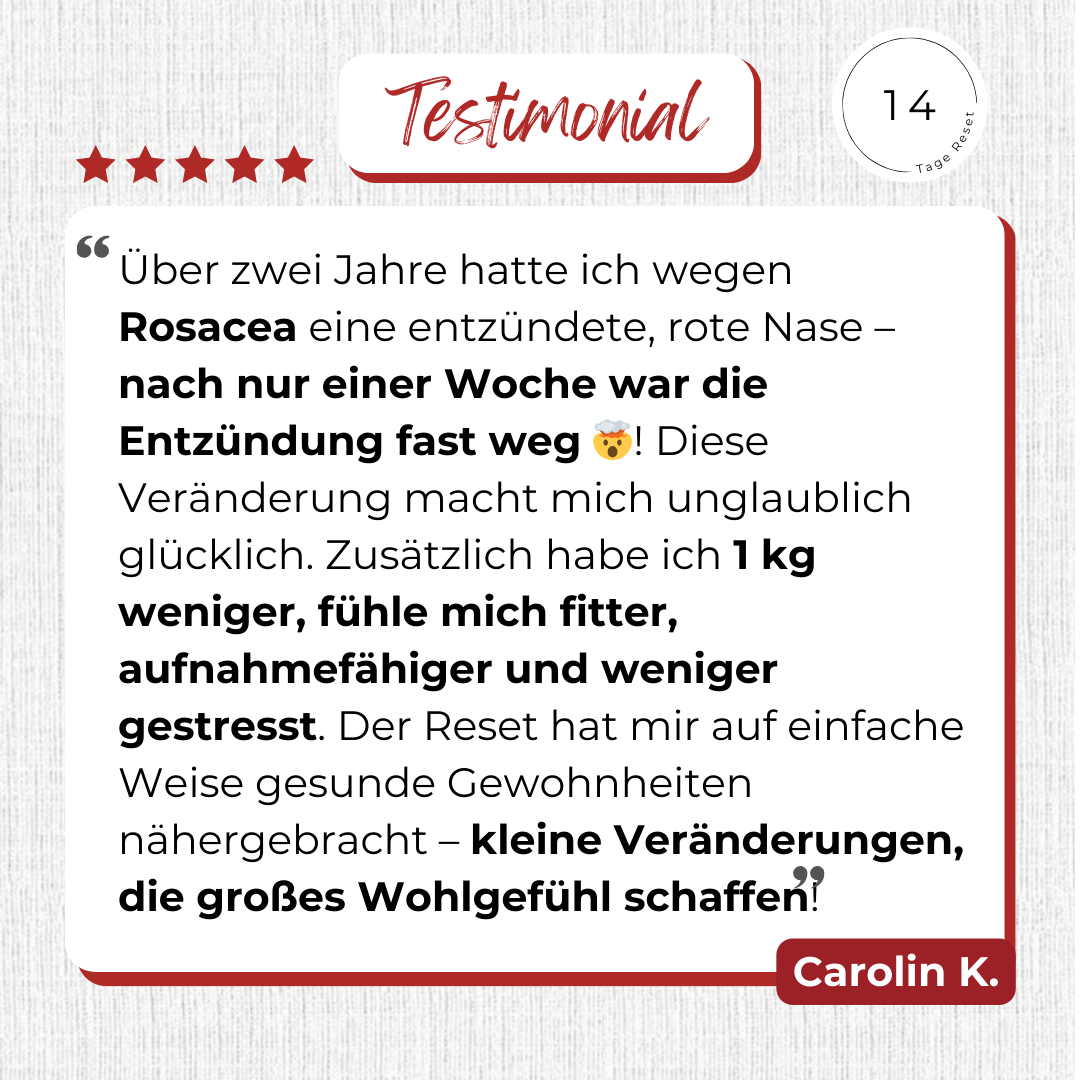 Möchtest du deine Gesundheit verbessern? Schau dir diese Erfolgsgeschichten aus unserem 14-Tage-Reset-Programm an. Erfahre, wie andere ihre Gesundheit transformiert, ihre Energie gesteigert und sich rundum besser gefühlt haben. Lass dich von diesen Geschichten inspirieren, beim nächsten 14-Tage-Reset mitzumachen und deine eigene Reise zu besserer Gesundheit zu starten.