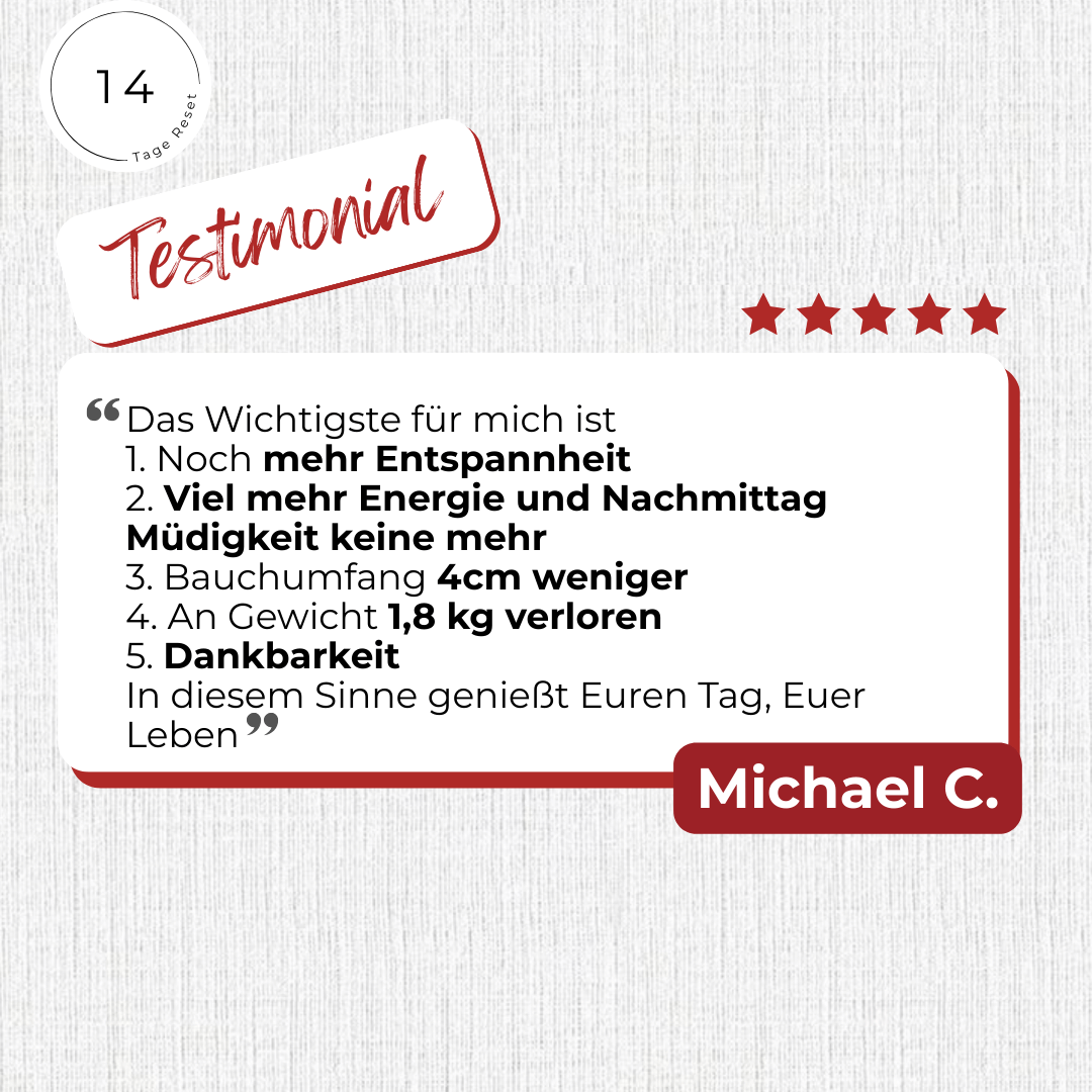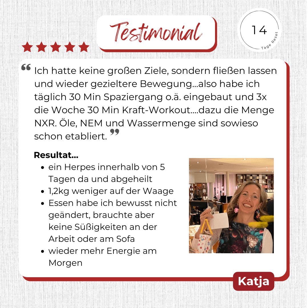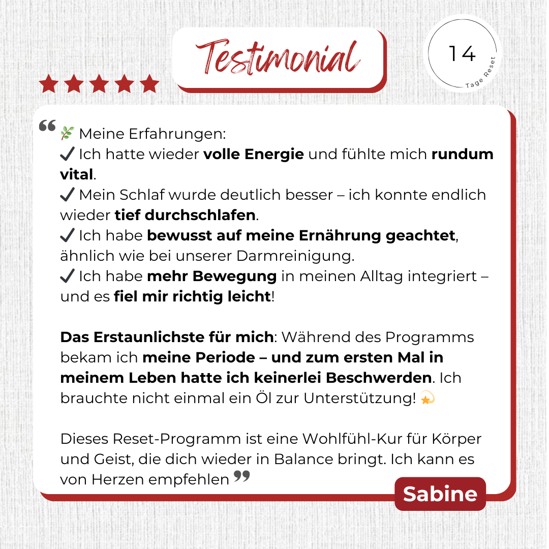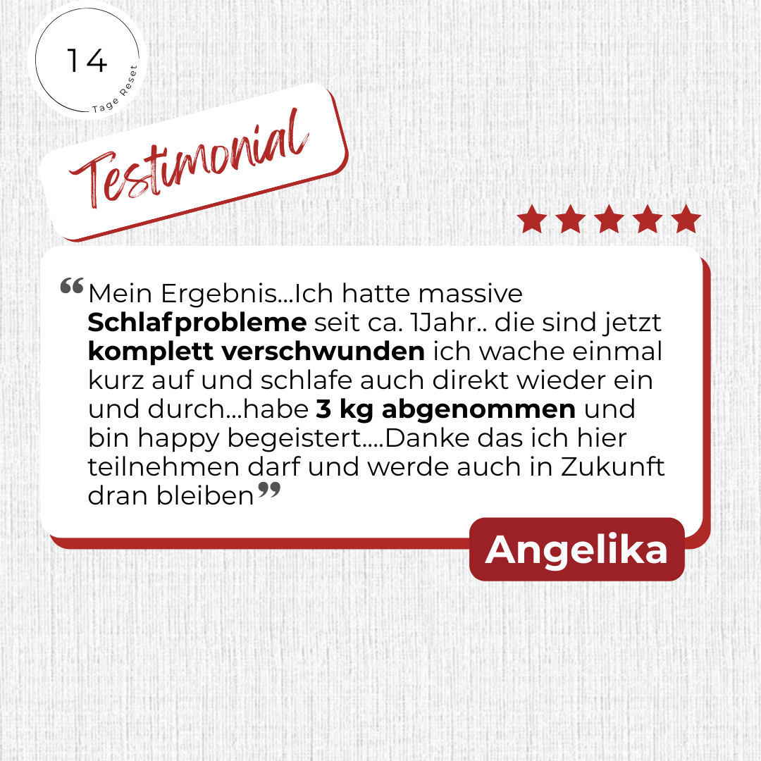 Möchtest du deine Gesundheit verbessern? Schau dir diese Erfolgsgeschichten aus unserem 14-Tage-Reset-Programm an. Erfahre, wie andere ihre Gesundheit transformiert, ihre Energie gesteigert und sich rundum besser gefühlt haben. Lass dich von diesen Geschichten inspirieren, beim nächsten 14-Tage-Reset mitzumachen und deine eigene Reise zu besserer Gesundheit zu starten.