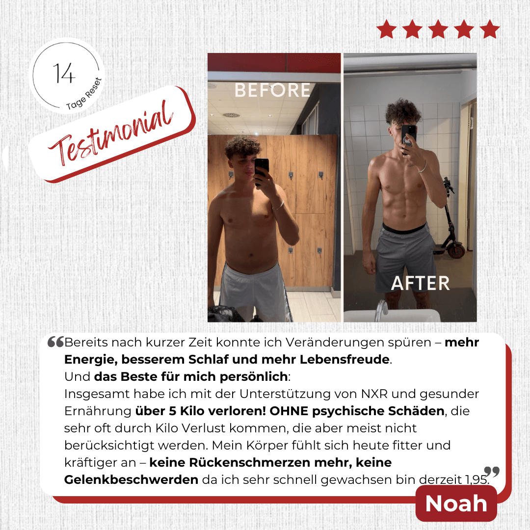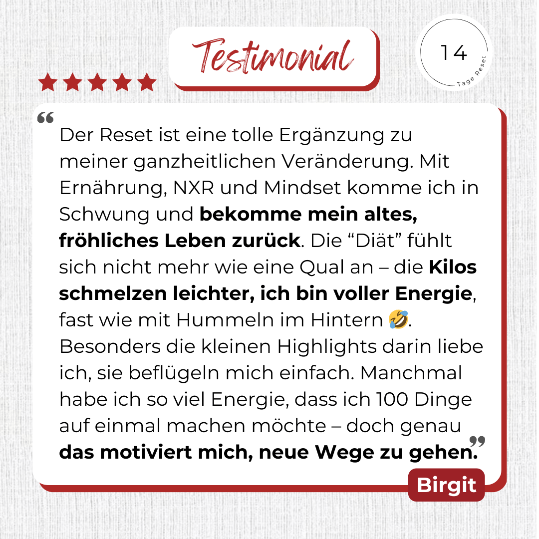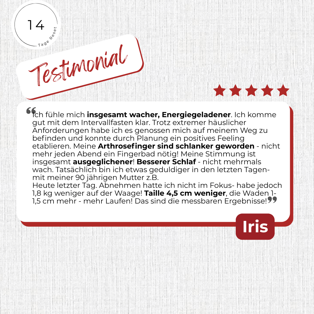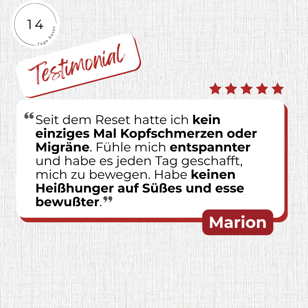 Möchtest du deine Gesundheit verbessern? Schau dir diese Erfolgsgeschichten aus unserem 14-Tage-Reset-Programm an. Erfahre, wie andere ihre Gesundheit transformiert, ihre Energie gesteigert und sich rundum besser gefühlt haben. Lass dich von diesen Geschichten inspirieren, beim nächsten 14-Tage-Reset mitzumachen und deine eigene Reise zu besserer Gesundheit zu starten.