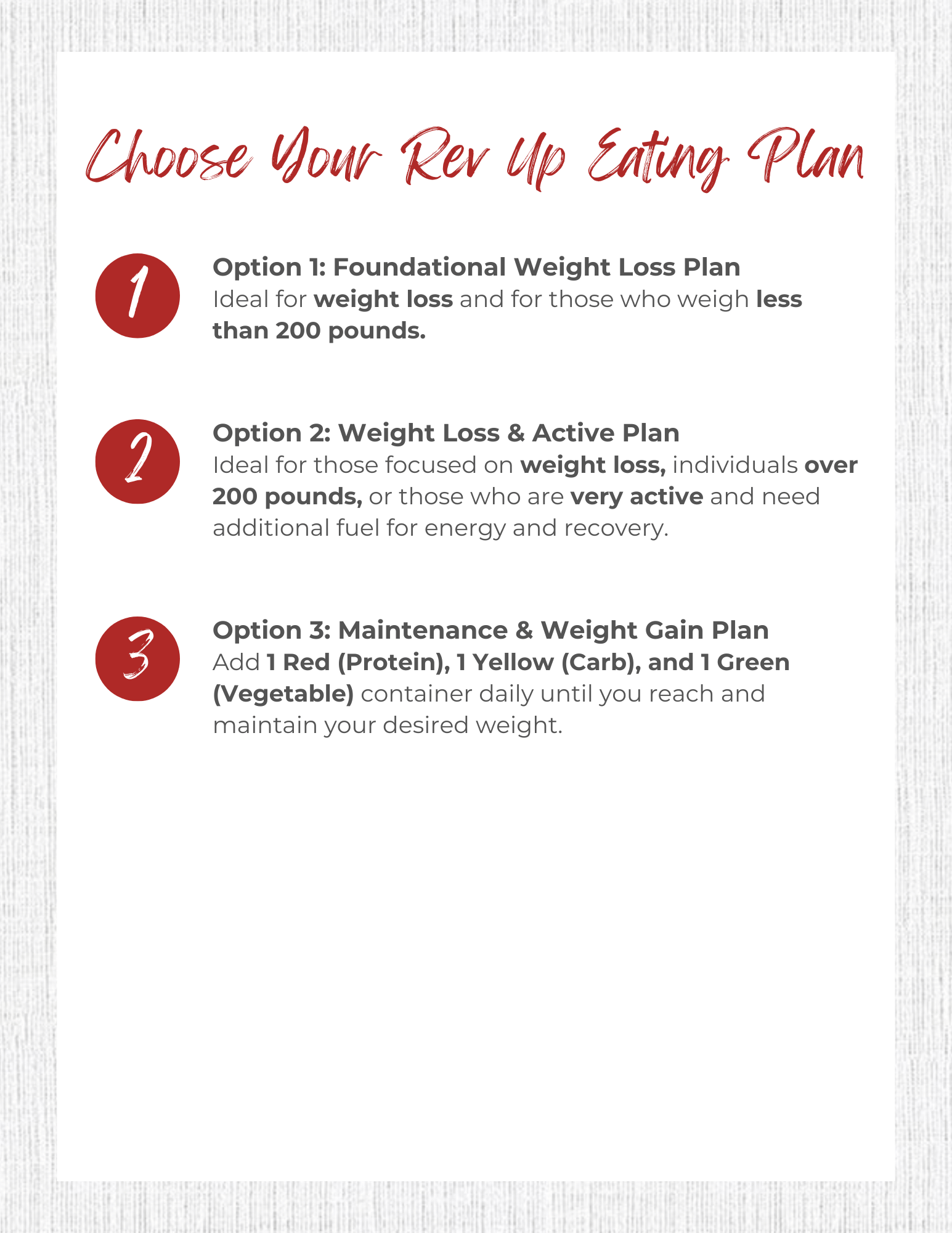 The Rev Up Eating Plan is a simple, sustainable approach to fueling your body for lasting results. Using portion control containers, you’ll enjoy balanced meals without the hassle of counting calories or tracking macros. Each color-coded container helps you get the right mix of proteins, healthy carbs, and fats—taking the guesswork out of eating well.